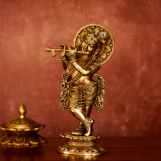 Krishna with Cow Brass Statue 10" with Antique Polish
