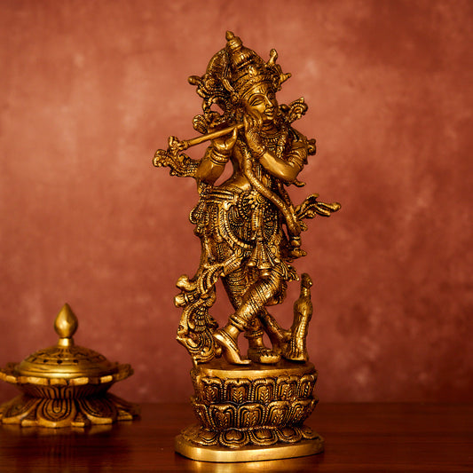 Bal Krishna with Peacock Brass Idol, 8" with Antique Polish