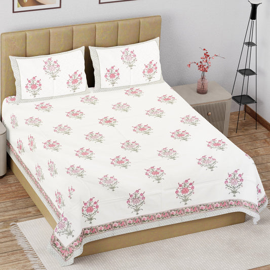 Pink Floral Essence Hand Block Printed Cotton Bedsheet
