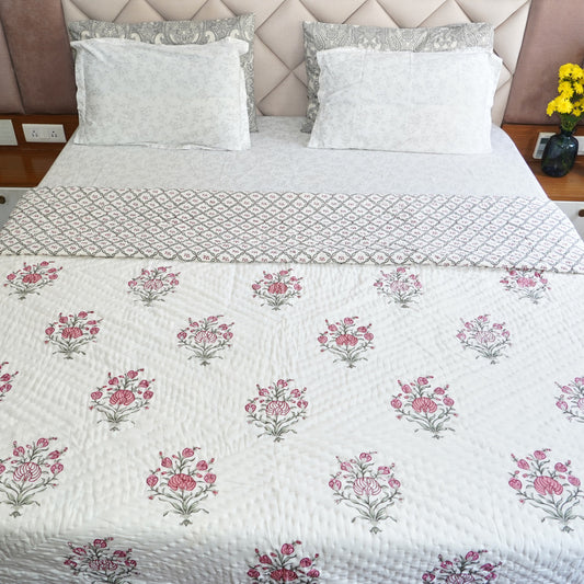 Pink Floral Essence Reversible Hand Block Printed Cotton Quilt