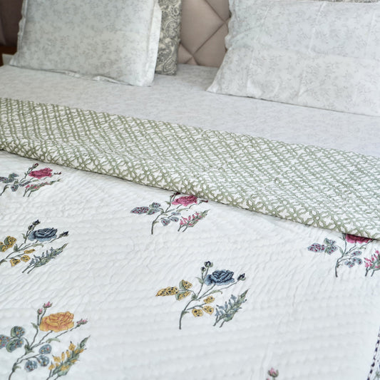 Rose Meadow Grace Reversible Hand Block Printed Cotton Quilt
