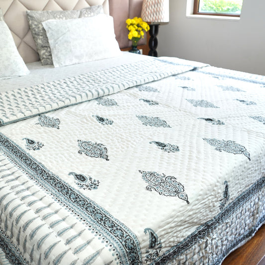 Blush Blue Elegance Reversible Hand Block Printed Cotton Quilt