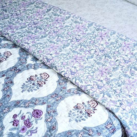 Violet Bloom Reversible Hand Block Printed Cotton Quilt