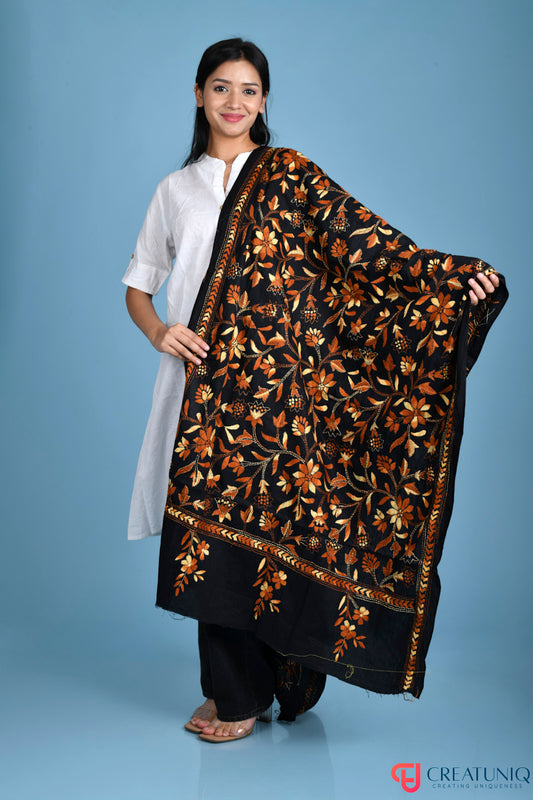 Floral Kantha Hand Embroidery Dupatta on Pure Cotton- Black