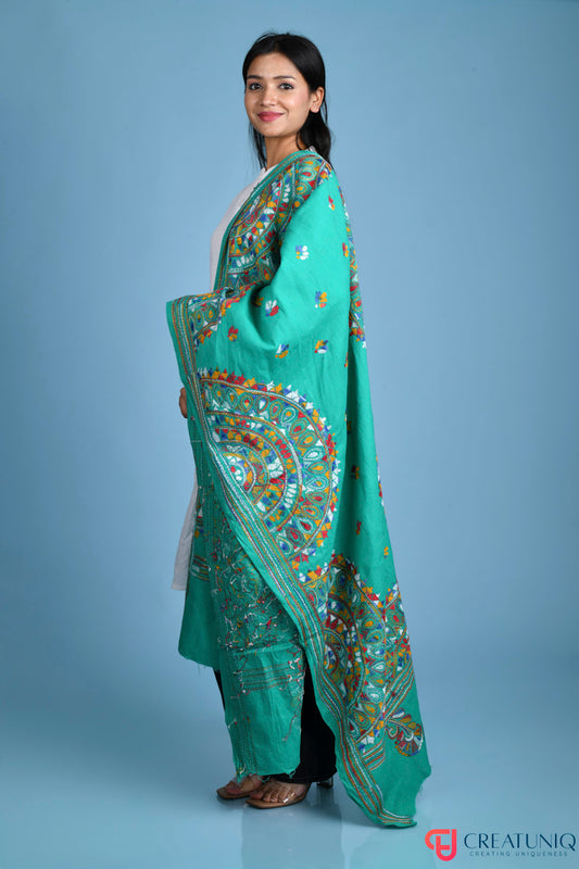 Floral Kantha Hand Embroidery Dupatta on Pure Cotton- Emerald Green