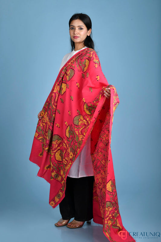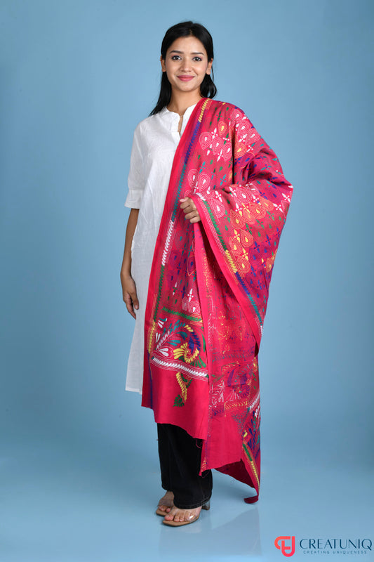 Floral Kantha Hand Embroidery Dupatta on Pure Cotton- Magenta