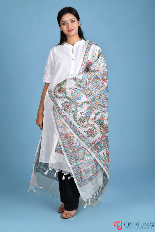 Madhubani Hand-Painted Pure Tussar Silk Dupatta – Floral Motifs