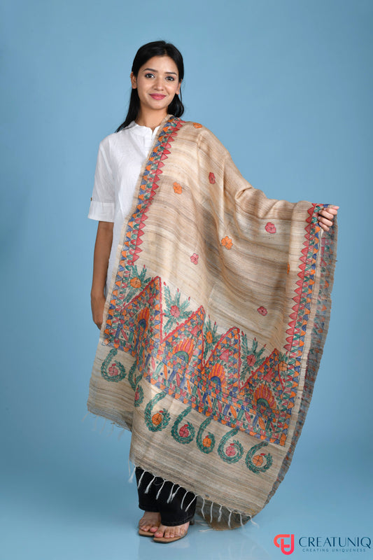 Madhubani Hand-Painted Tussar Ghicha Silk Dupatta – Floral Heritage