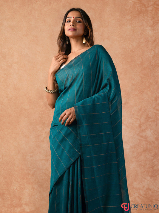 Katia Strip Bengal Handloom Pure Mul Cotton Saree – Blue & Grey