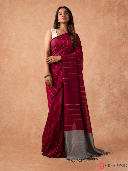 Katia Strip Bengal Handloom Pure Mul Cotton Saree – Red & Grey