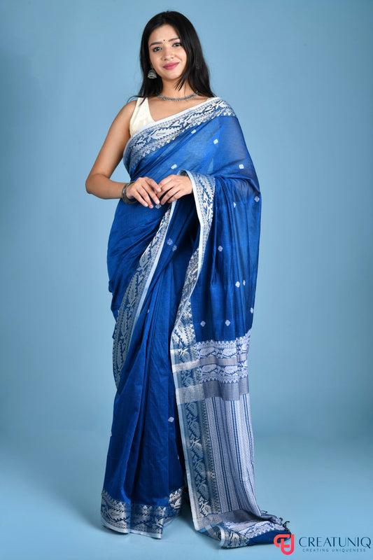Pure Cotton Blue Saree with Traditional Buti and Artistic Pallu
