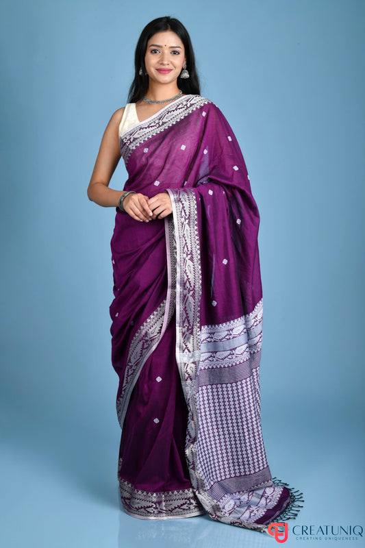 Pure Cotton Purple Saree with Traditional Buti and Artistic Pallu