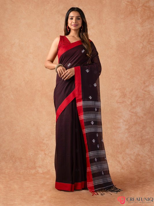 Red Border Handloom Pure Cotton Saree with Arrow Motif – Brown