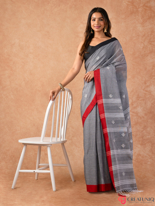 Red Border Handloom Pure Cotton Saree with Arrow Motif – Grey