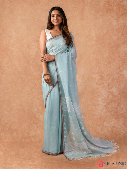 White Ball Buti Handloom Bengal Pure Cotton Saree – Sky Blue